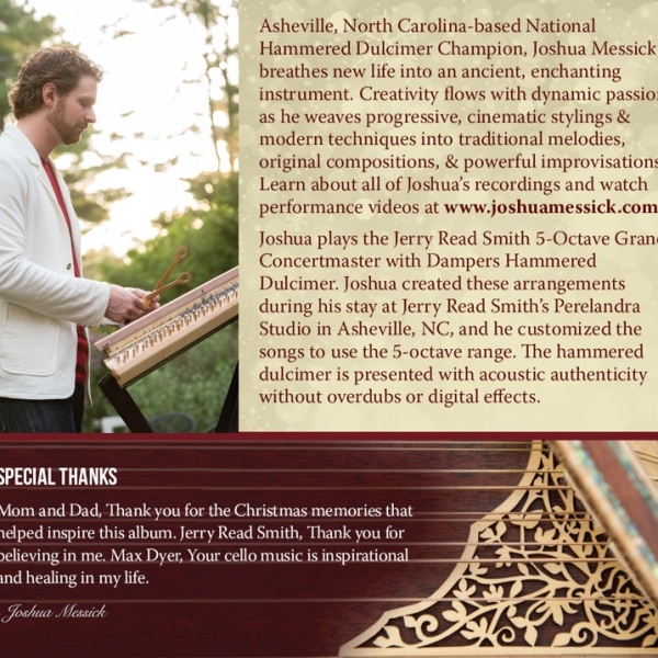 With “Hammered Dulcimer Christmas” Joshua Messick has set a new standard, both for hammered dulcimer recordings and for Christmas albums. His command of the instrument is nothing short of astonishing, his imagination is restlessly creative, and his interpretations of the season’s carols and hymns take them into fascinating new realms while always honoring their integrity. He balances tradition and innovation superbly to give us a fresh, exciting take on holiday favorites that never violates their spirit. “Hammered Dulcimer Christmas” is a beautiful and transcendent listening experience – an essential addition to every Christmas CD collection.